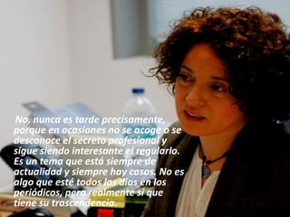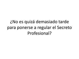 El documento discute la importancia y dificultad de regular el secreto profesional para periodistas. Aunque España reconoció constitucionalmente el secreto profesional, no ha legislado sobre el tema como otros países europeos. Regular el secreto profesional daría más seguridad a los periodistas, pero también plantea retos al definir los límites del secreto y quién califica como un profesional.