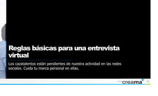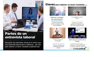 Este documento ofrece consejos para preparar una entrevista de trabajo virtual. Explica que aunque una entrevista virtual permite la distancia, sigue siendo una primera impresión importante para el entrevistador. Recomienda actualizar la aplicación de videollamada, cuidar las redes sociales, vestirse adecuadamente, preparar el fondo y la iluminación, aislarse de ruidos, probar el micrófono y la conexión a Internet, y grabar la entrevista para analizarla después.