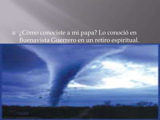 La persona conoció a su papá en un retiro espiritual en Buenavista Guerrero. Su mamá trabaja como maestra y tiene 36 años. Su boda y aniversario se celebraron en diferentes lugares, la boda en Buenavista Guerrero y el aniversario en Las Vegas.