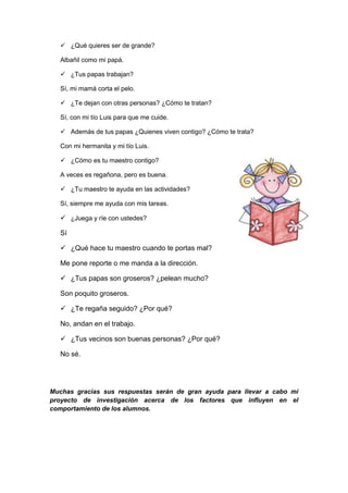 Este documento contiene las respuestas de un alumno de primer grado, los padres de un alumno de tercer grado y una maestra de primer grado a una entrevista sobre los factores que influyen en el comportamiento de los estudiantes. El alumno menciona que se lleva bien con sus compañeros y maestros. Los padres dicen que fomentan buenos ejemplos y castigan malos comportamientos. La maestra atribuye problemas de conducta a factores familiares y socioeconómicos.