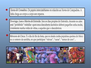 El documento habla sobre el origen, época y duración del Carnaval en Galicia. Explica que el Carnaval presenta un aspecto de "mundo al revés" donde se permiten cosas que el resto del año no lo están. Describe las diferentes máscaras y trajes tradicionales que se usan en el Carnaval en diferentes zonas de Galicia, incluyendo los Cigarróns de Verín, Peliqueiros de Laza, Boteiros de Viana, Felos de Maceda, Xenerais da Ulla, Madamas y Galáns de Cobres, Volantes de