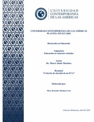 Este documento describe los criterios para seleccionar un entorno virtual de aprendizaje (EVA). Discute características técnicas como el tipo de licencia, idioma, sistema operativo y comunidad de usuarios. También cubre características pedagógicas como tareas de gestión, comunicación, desarrollo de contenido, actividades interactivas y evaluación de estudiantes. El objetivo es analizar las principales características de los EVAs a través de una revisión bibliográfica y actividades de aprendizaje para elegir el EVA más
