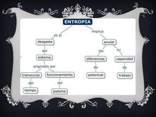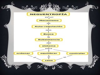 El documento explica los conceptos de entropía y neguentropía. La entropía se refiere al desorden en un sistema cerrado que tiende al desgaste, mientras que la neguentropía ayuda a mantener el orden y equilibrio en sistemas abiertos a través de mecanismos de regulación. Se dan ejemplos de cómo la entropía ocurre en instituciones educativas y la sociedad debido al incumplimiento de reglas, pero la neguentropía reduce este desorden a través de figuras de autoridad.
