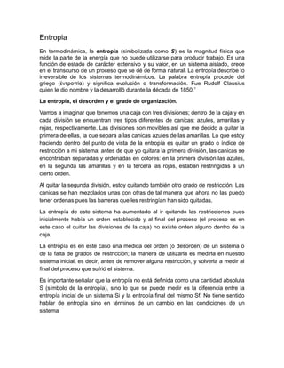 La entropía mide la parte de la energía que no puede usarse para producir trabajo. Aumenta en sistemas aislados a medida que ocurren procesos naturales de forma irreversible. Se puede usar para medir el desorden o falta de organización en un sistema, comparando los estados inicial y final luego de quitar restricciones. La sinergia se refiere a cuando dos o más elementos juntos producen un resultado mayor que la suma de sus partes individuales. El holismo analiza los eventos considerando las múltiples interacciones entre sus componentes, viendo al sistema completo