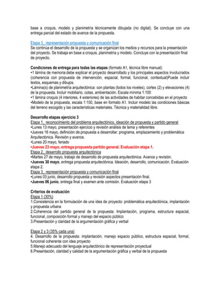 Este documento describe un ejercicio de arquitectura que se desarrollará entre el 13 de mayo y el 6 de junio de 2013. El objetivo es que los estudiantes diseñen un proyecto arquitectónico para algún equipamiento público propuesto previamente como parte de un proyecto de intervención urbana en Antuco, Chile. El proceso incluye tres etapas: en la primera se analizan referentes y se define una propuesta inicial; en la segunda se desarrolla más la propuesta arquitectónica; y en la tercera se finaliza el
