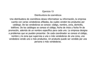 Este documento describe los requisitos para informatizar la información de una distribuidora de cosméticos. La distribuidora tiene varias vendedoras afiliadas que venden productos por catálogo. Se necesita almacenar información sobre las vendedoras (código, nombre, zona, domicilio, teléfono), los catálogos (código, fechas de inicio y fin de promoción, nombre), los coordinadores (código, nombre, zona supervisada) y las ventas de productos por vendedora.