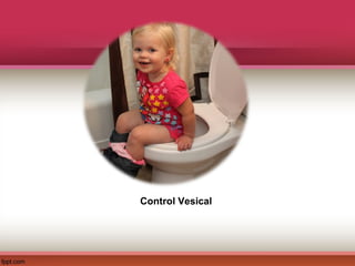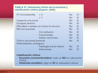 Este documento describe el control vesical, el trastorno de enuresis, su epidemiología, etiología, clasificación, evaluación, consecuencias y manejo. La enuresis es la micción involuntaria durante el sueño en niños mayores de 5 años que ocurre al menos 2 veces por semana. Su etiología es multifactorial. El manejo incluye medidas generales, alarma para despertar, y en algunos casos tratamiento farmacológico. La evaluación requiere anamnesis detallada, diario miccional y examen físico.