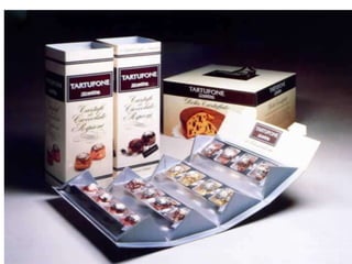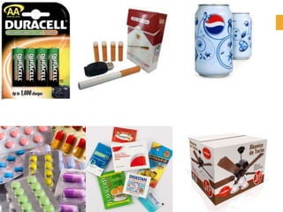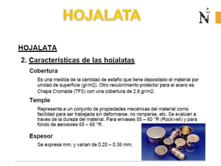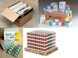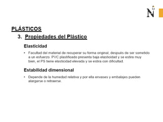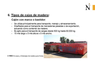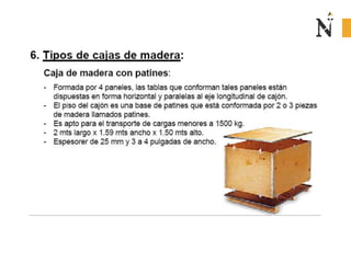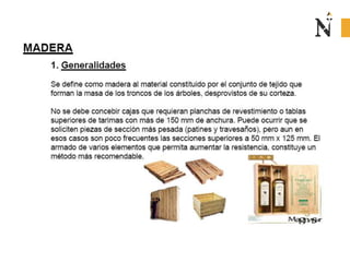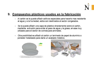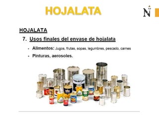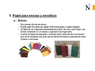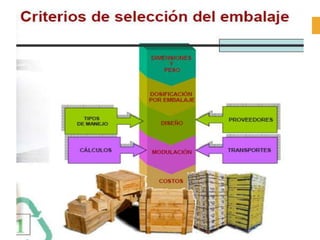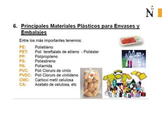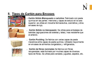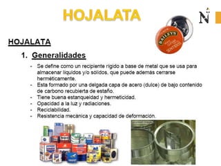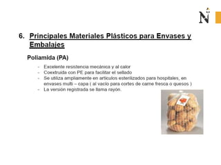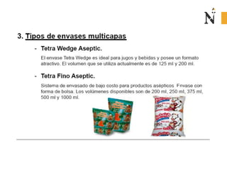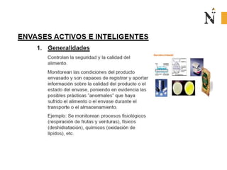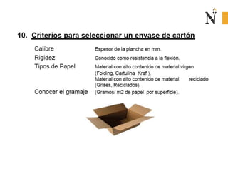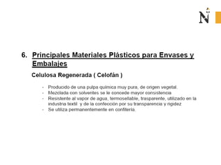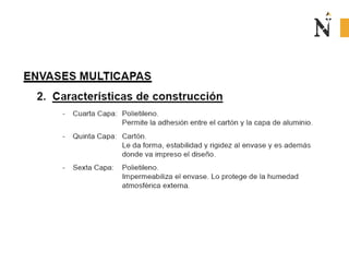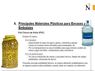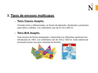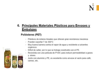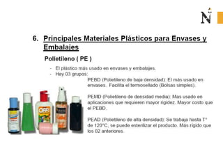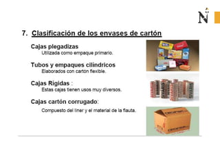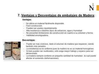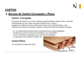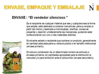 El documento presenta información sobre envases, empaques y embalajes. Explica que el envase es el envolvente en contacto directo con el producto y debe llamar la atención del consumidor. El empaque facilita la exhibición del producto en el anaquel e incluye información. El embalaje agrupa envases u objetos para facilitar su manejo, almacenamiento y transporte. Además, describe diferentes materiales como plástico, cartón, madera y aluminio usados para envases y sus características.