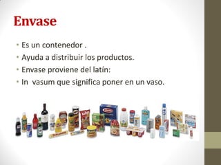 Este documento proporciona una introducción a los conceptos básicos relacionados con los envases. Define los tipos primarios y secundarios de envases, así como embalajes, exhibidores y etiquetas. Explica las funciones de los envases como contener, proteger, informar y diferenciar productos. También cubre consideraciones de diseño como las características del producto y mercado, y la función de venta del envase para atraer atención e impulsar las compras.