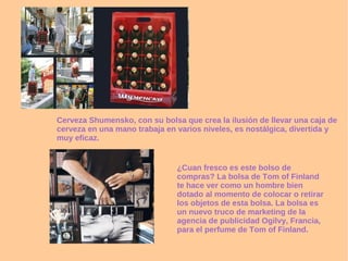 El documento presenta varios ejemplos de bolsas de compras diseñadas para campañas de marketing de diferentes marcas. Algunas bolsas se diseñaron para crear ilusiones divertidas que atraen la atención, mientras que otras usan mensajes e imágenes relacionadas con las causas o productos que promueven, como ahorro de energía, apoyo a animales, y alimentos y suplementos saludables. Las bolsas funcionan como una forma creativa e ingeniosa de publicidad callejera.