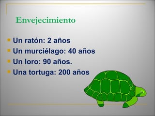 Los animales envejecen a diferentes ritmos: los ratones en 2 años, los murciélagos en 40 años, los loros en 90 años y las tortugas en 200 años. El envejecimiento es un proceso multifactorial determinado genéticamente y por factores ambientales como la radiación y el tabaco, los cuales producen radicales libres que dañan la piel. Con la edad, disminuye la producción de colágeno en la piel y aumentan las enzimas que lo degradan.