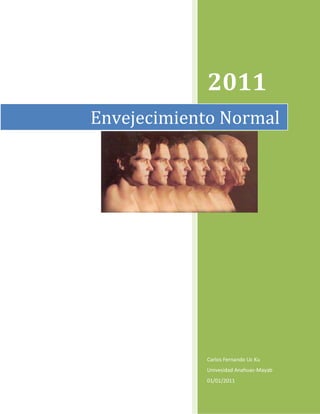 Este documento describe el envejecimiento normal. Define el envejecimiento como un proceso heterogéneo e irreversible que conduce a una pérdida progresiva de la función de los órganos. Explica que el envejecimiento normal ocurre sin enfermedades y lleva a cambios fisiológicos en todo el cuerpo, como en el sistema cardiovascular, digestivo y nervioso. Finalmente, resume varias teorías sobre la etiología del envejecimiento, incluidas las teorías estocásticas que implican daños celulares aleatorios