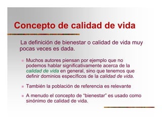 El documento resume los principales conceptos y medidas de calidad de vida. Define la calidad de vida como un término multidimensional que incluye buenas condiciones de vida objetivas, alto bienestar subjetivo y satisfacción de necesidades individuales y colectivas a través de políticas sociales. Explica que la calidad de vida depende de factores materiales, ambientales, de relacionamiento y políticas gubernamentales. Finalmente, señala que medir la calidad de vida en adultos mayores es problemático debido a la falta de definición clara y te