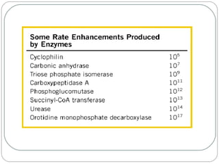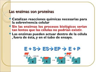 Las enzimas son proteínas que catalizan reacciones químicas necesarias para la vida celular. Cada enzima tiene un sitio activo que reduce la energía de activación de las reacciones, acelerándolas enormemente. Las enzimas aumentan la velocidad de las reacciones bioquímicas actuando como catalizadores específicos y regulables.