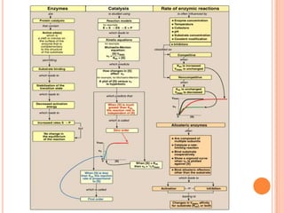 Las enzimas son moléculas catalíticas que aceleran las reacciones químicas en el cuerpo. Poseen un sitio activo que une al sustrato y reduce la energía de activación de la reacción. Factores como la concentración del sustrato, el pH y la temperatura afectan la velocidad de la reacción enzimática, la cual sigue generalmente la cinética de Michaelis-Menten.