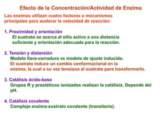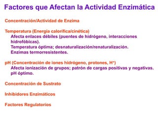 Este documento describe varios factores que afectan la actividad enzimática, incluyendo la temperatura, el pH, la concentración de sustrato e inhibidores. También explica los modelos de unión del sustrato a la enzima y los tipos de inhibición enzimática.