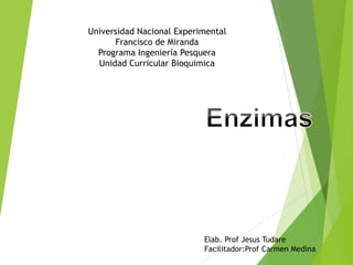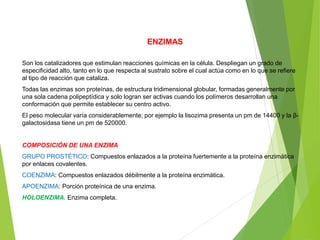 Este documento trata sobre las enzimas. Explica que las enzimas son proteínas que actúan como catalizadores de reacciones químicas en la célula. Se componen de una porción proteínica y, a veces, de un grupo prostético o coenzima. Las enzimas exhiben alta especificidad por su sustrato y tipo de reacción catalizada.
