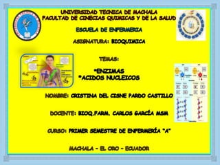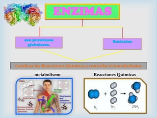 Las enzimas son proteínas globulares que catalizan reacciones químicas y controlan el metabolismo. Existen dos tipos de ácidos nucleicos: el ADN y el ARN. El ADN contiene instrucciones genéticas y es responsable de la transmisión hereditaria, mientras que el ARN tiene varios roles como mensajero, ribosomal y de transferencia en la síntesis de proteínas.