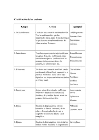 Las enzimas son proteínas que catalizan reacciones químicas en las células, acelerándolas hasta millones de veces sin ser consumidas. Casi todos los procesos celulares requieren enzimas. Las enzimas se clasifican por la reacción que catalizan, como oxidorreductasas, transferasas e hidrolasas.