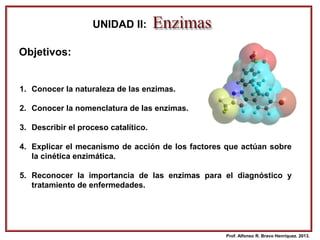 Este documento presenta información sobre las enzimas. Sus objetivos son conocer la naturaleza de las enzimas, su nomenclatura, su mecanismo de acción y los factores que afectan su actividad. Explica que las enzimas son proteínas que catalizan reacciones químicas y describe sus características, clasificación, cinética enzimática y cómo factores como la concentración de sustrato, pH y temperatura influyen en su actividad.