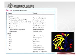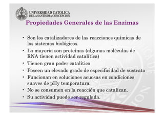 Este documento describe las características y funciones de las enzimas. Las enzimas son proteínas que actúan como catalizadores de las reacciones químicas en los sistemas biológicos. Disminuyen la energía de activación de las reacciones, acelerando así su velocidad. Funcionan uniéndose específicamente a sus sustratos y creando un ambiente que favorece la reacción química en su sitio activo. Luego se separan de los productos sin haber cambiado ellas mismas.