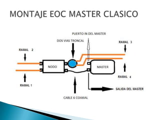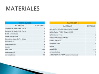 El documento proporciona una lista de materiales y equipos para dos tipos diferentes de sistemas de televisión por cable: un sistema maestro clásico y un sistema maestro 3 en 1. El sistema maestro clásico utiliza menos materiales coaxiales y puede funcionar en nodos y redes existentes, mientras que el sistema maestro 3 en 1 solo tiene dos salidas, requiere desmontar nodos existentes y utiliza una mayor cantidad de materiales coaxiales.