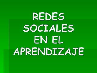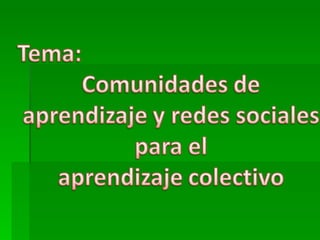 Las redes sociales y entornos virtuales de aprendizaje permiten que grupos de personas con intereses comunes aprendan juntos de forma colaborativa y a largo plazo. Estos grupos se basan en la confianza, el reconocimiento de la diversidad y la disposición a compartir experiencias y conocimientos. Las redes sociales amplían las posibilidades de aprendizaje al conectar a las personas con fuentes significativas de conocimiento y comunidades que comparten aprendizaje.