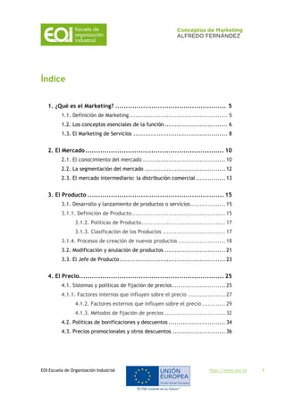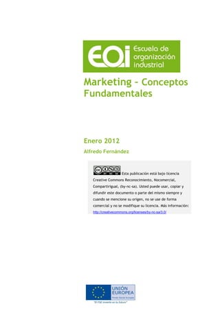 Este documento proporciona una introducción a los conceptos fundamentales de marketing. Explica que el marketing no es solo un departamento de la empresa, sino una forma de entender los negocios centrada en la satisfacción del cliente. Define el marketing como una ciencia que estudia el comportamiento de compradores y vendedores. También describe conceptos clave como el posicionamiento, las ventajas competitivas diferenciales, y el marketing mix, que incluye factores como el producto, precio, plaza y promoción. El objetivo del marketing es ayudar a las empresas a atraer clientes