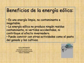 Eolopower es una empresa ubicada en Sevilla que se dedica a la instalación de sistemas eólicos domésticos. Presenta los beneficios de la energía eólica, como ser renovable e inagotable. Describe los componentes de una instalación eólica doméstica y su funcionamiento.