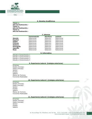 El documento es una solicitud de empleo de Conservación Internacional Perú que incluye una política de protección de datos, una solicitud con información personal y laboral del candidato, y una declaración de confidencialidad. La organización recopilará los datos proporcionados por los candidatos con fines de selección de personal y se compromete a mantener la información de forma confidencial.