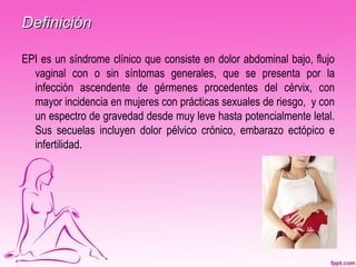 La enfermedad pélvica inflamatoria (EPI) es una infección del tracto reproductivo femenino causada comúnmente por bacterias como Neisseria gonorrhoeae y Chlamydia trachomatis. Los síntomas incluyen dolor abdominal bajo y flujo vaginal anormal. El tratamiento consiste en antibióticos para prevenir secuelas como dolor crónico, infertilidad o embarazo ectópico. La detección temprana y tratamiento adecuado son fundamentales para mejorar los resultados y la calidad de vida de las
