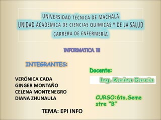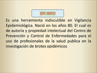 Este documento describe Epi Info, una herramienta de software gratuita y de código abierto desarrollada por los CDC para la vigilancia epidemiológica. Explica que Epi Info surgió en los años 80 y ha evolucionado a través de varias versiones para diferentes sistemas operativos. También resume las principales funcionalidades de Epi Info como el procesamiento de textos, uso de bases de datos, aplicación de estadísticas y producción de informes.