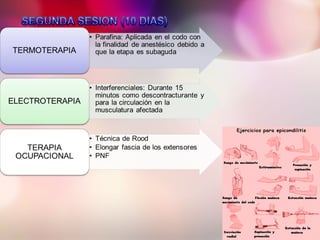 Este documento trata sobre la epicondilitis, una lesión caracterizada por dolor en la cara externa del codo causada por movimientos repetitivos. Presenta el caso de una paciente de 47 años que sufrió una caída en el codo y desarrolló dolor al trabajar, siendo diagnosticada con epicondilitis. Explica la anatomía del codo, factores de riesgo, síntomas, pruebas de diagnóstico y conclusiones sobre la importancia del tratamiento temprano para evitar incapacidad.