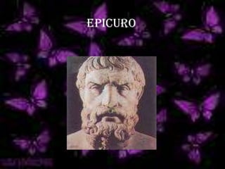 Epicuro fue un filósofo griego nacido en la isla de Samos en el siglo IV a.C. Estudió filosofía desde muy joven y fundó su propia escuela llamada "El Jardín" en Atenas, donde enseñó que el camino a la felicidad es a través de la virtud y la eliminación del dolor y el miedo. Escribió más de 300 obras pero solo sobreviven algunos fragmentos. Su filosofía conocida como epicureísmo promovía el placer intelectual y la amistad como medi