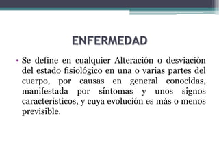 Este documento resume la historia de la salud y la enfermedad desde la medicina primitiva hasta la actualidad. Explica cómo las concepciones de la enfermedad han evolucionado de ser atribuidas a fuerzas sobrenaturales a entenderse como desequilibrios biológicos y cómo los descubrimientos recientes han llevado a explicaciones más complejas que involucran factores biológicos, psicológicos y sociales. También introduce el concepto de la cadena epidemiológica y sus componentes: agente, huésped y amb