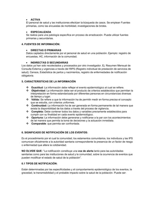 La epidemiología estudia la enfermedad en poblaciones humanas y tiene como objetivo la prevención y control de problemas de salud pública. La vigilancia epidemiológica recolecta y analiza información de salud para planificar intervenciones y evaluar su efectividad. Incluye la notificación de eventos de salud para alertar a las autoridades y tomar medidas oportunas para modificar el estado de salud de la población.