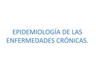 Este documento trata sobre la epidemiología de las enfermedades crónicas. Explica que las enfermedades crónicas son patologías que se prolongan en el tiempo y frecuentemente interfieren con las actividades habituales de la persona. Luego describe las principales causas de sufrimiento para los pacientes con enfermedades crónicas y las necesidades que tienen, incluyendo el apoyo físico, psicológico y social. Finalmente, recomienda medidas para prevenir enfermedades crónicas.