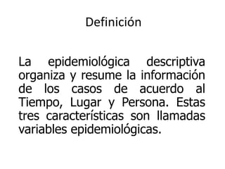 La epidemiología descriptiva resume información sobre casos según variables como tiempo, lugar y persona. Describe la frecuencia con la que ocurren eventos de salud en una población sin analizar vínculos entre exposición y efecto. Ofrece medidas como razones, tasas y estadísticas descriptivas para generar hipótesis sobre posibles factores causales.