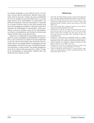 El documento discute cómo las enfermedades no transmisibles como la obesidad y el tabaquismo se pueden propagar a través de redes sociales, a pesar de que tradicionalmente no se consideraban enfermedades contagiosas. Los factores de riesgo como la obesidad tienen una probabilidad mayor de propagarse entre amigos y familiares cercanos a través de mecanismos como la imitación. Comprender mejor estos mecanismos de propagación social podría ayudar a desarrollar intervenciones efectivas para prevenir la propagación de enfermedades