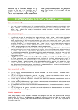 El documento presenta el relato bíblico de la Epifanía, donde unos magos siguen una estrella para encontrar a Jesús recién nacido. Luego analiza las actitudes de tres grupos ante Jesús: los magos que lo buscan guiados por la estrella, los representantes religiosos que permanecen indiferentes a pesar de conocer las escrituras, y el rey Herodes que ve en él una amenaza a su poder. Finalmente, destaca que Dios se revela a quienes lo buscan con humildad y no a quienes se aferran al poder o