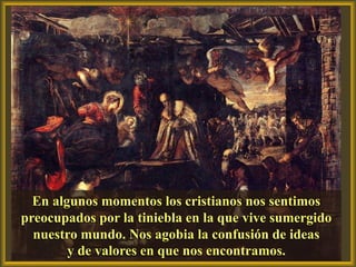 El documento resume la historia de los Reyes Magos que buscaron a Jesús recién nacido siguiendo su estrella, y compara su búsqueda de la manifestación de Dios con la necesidad de los cristianos de buscar la luz en tiempos de oscuridad. También ve en los Reyes Magos una prefiguración de las dimensiones política, científica y religiosa del humanismo, y pide que los líderes en esas áreas sigan su ejemplo de humildad y búsqueda de la verdad.