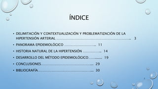 Este documento presenta un estudio epidemiológico sobre la hipertensión arterial. Explica la definición de hipertensión según la OMS y sus causas, síntomas y complicaciones. Luego describe la epidemiología de la enfermedad en México según datos del SINAVE, mostrando que afecta principalmente a adultos mayores de 65 años. Finalmente analiza la prevención primaria, secundaria y terciaria de la hipertensión arterial.