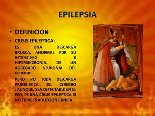 Este documento describe la epilepsia, incluyendo su definición, tipos de crisis epilépticas, causas, clasificación, diagnóstico y tratamiento. Explica que la epilepsia es un trastorno neurológico frecuente causado por descargas anormales y sincronizadas de neuronas en el cerebro, y que puede ser de origen genético, adquirido por traumatismos o infecciones, entre otras causas. También cubre los diferentes tipos de crisis epilépticas, exámenes para el diagnóstico y