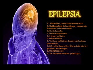 1) El documento trata sobre la epilepsia, incluyendo su definición, clasificación, epidemiología, tipos de crisis epilépticas, estado epiléptico, crisis febriles y no epilépticas.