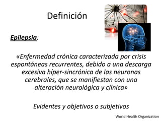 Epilepsia es una enfermedad crónica caracterizada por crisis recurrentes debido a una descarga excesiva de las neuronas cerebrales. Existen diferentes tipos de crisis como focales, generalizadas primarias y sin clasificar. La epilepsia puede deberse a causas genéticas, estructurales, metabólicas o desconocidas. El diagnóstico requiere historia clínica, examen físico, pruebas complementarias como EEG e imagenología.