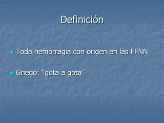 Este documento describe la epistaxis o hemorragia nasal. Define la epistaxis como cualquier hemorragia con origen en las fosas nasales. Explica que es la causa más común de consulta urgente en ORL y que es más frecuente en niños, adolescentes y personas mayores. Describe los tipos de epistaxis anterior y posterior, sus causas locales y sistémicas, y las normas generales y recomendaciones para el tratamiento, incluyendo la compresión, el taponamiento y en casos graves la derivación al hospital.