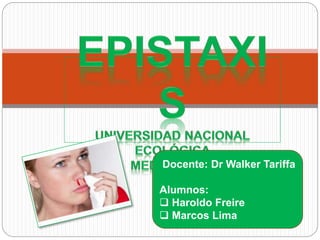 Este documento presenta información sobre la epistaxis, incluyendo su etiología, anatomía vascular nasal, clasificación, evaluación y tratamiento. Se explican diferentes métodos para el tratamiento de la epistaxis como la cauterización, taponamiento nasal y ligadura arterial en casos graves o recurrentes. El documento proporciona detalles sobre la evaluación clínica de la epistaxis y las opciones quirúrgicas cuando el sangrado no se controla con otros métodos.