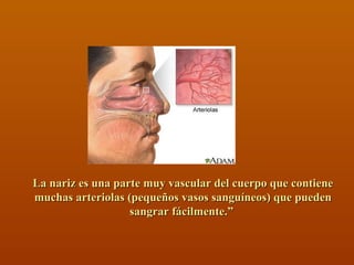 Este documento describe la epistaxis o sangrado nasal. Define la epistaxis, sus causas, signos y síntomas. Explica los exámenes de diagnóstico y los tratamientos para epistaxis anterior como la cauterización y taponamiento nasal. También cubre los tratamientos para epistaxis posterior como taponamiento nasal posterior, sonda Foley y balón de taponamiento. Resalta la importancia de realizar un examen cuidadoso después de retirar el taponamiento.