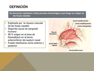 La epistaxis es un proceso hemorrágico que tiene su origen en las fosas nasales. Se produce con mayor frecuencia en la infancia y entre los 35-40 años. El 98% de los casos tienen su origen en el área de Kiesselbach. El tratamiento depende de la gravedad, pudiendo realizarse cauterización con nitrato de plata para hemorragias leves o taponamiento posterior con gasa para hemorragias graves.