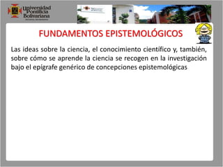 El documento presenta una introducción a los fundamentos epistemológicos de la investigación cuantitativa. Explica brevemente los diferentes paradigmas epistemológicos como el positivismo, el interpretativismo y el crítico, y describe los pasos básicos del método científico como la observación, la formulación de preguntas e hipótesis, la experimentación y la obtención de conclusiones.